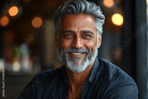 Smiling man with gray beard enjoying a cozy moment in a warm and inviting cafe environment during the early evening