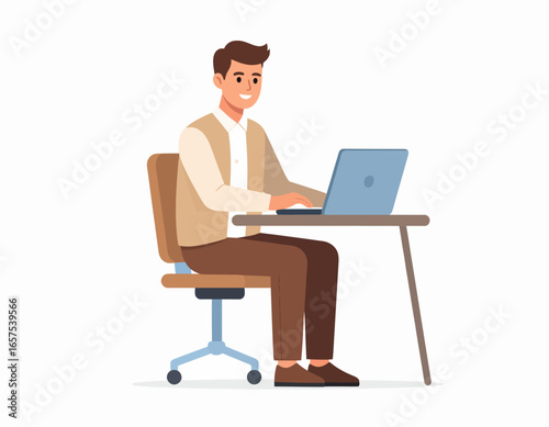 Smiling Man Working on Laptop at Desk.