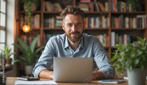 Smiling man working on laptop in a home office with bookshelves
