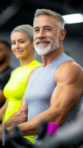 Smiling mature man is exercising at the gym alongside other people, wearing a gray tank top and sporting a beard.