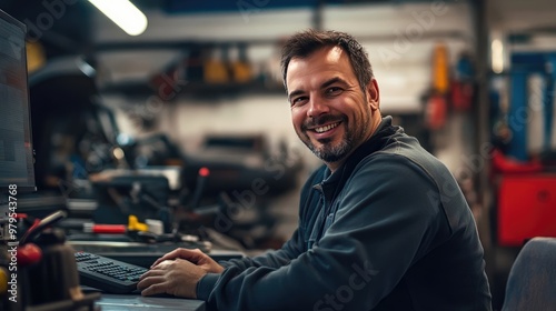 Smiling Mechanic Working on Laptop in Auto Repair Shop with Modern Car Parts Store in Background