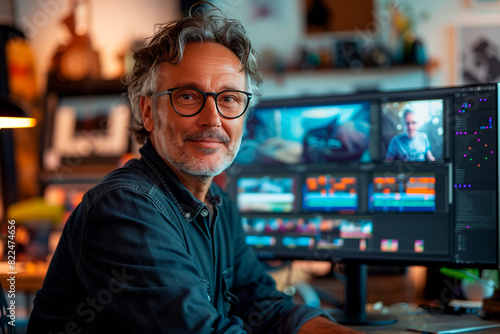 Smiling Middle-Aged Man in Glasses, Engaged in Video Edition on a Large Monitor Computer in His Home Studio