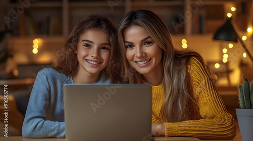 Smiling Mother and Daughter Using Laptop Photo