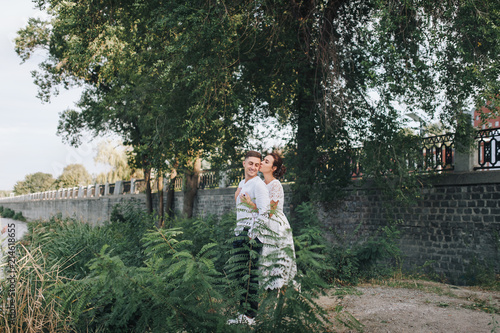 Smiling newlyweds are hugging against the background of green trees in the garden. A sweet bride is hugging a stylish bridegroom from behind and kissing him.