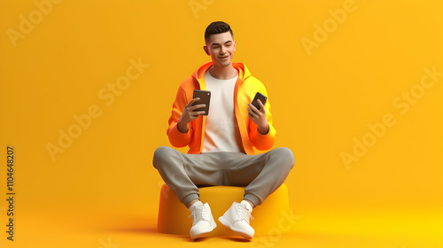Smiling Person Using Two Smartphones in an Orange Jacket