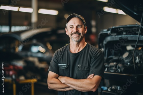 Smiling portrait of a middle aged Caucasian car mechanic in workshop