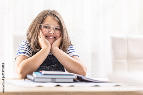 Smiling round-faced girl wearing glasses smiles over pile of school books