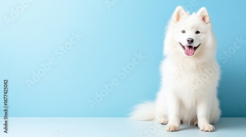 Smiling Samoyed Dog: A stunning portrait of a fluffy white Samoyed dog, radiating pure joy and happiness, set against a vibrant backdrop.