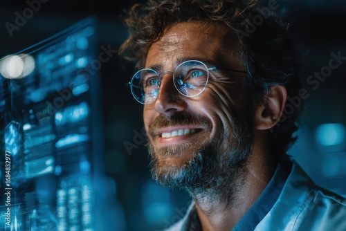 Smiling Scientist Engaged in Innovative Research with Digital Interface