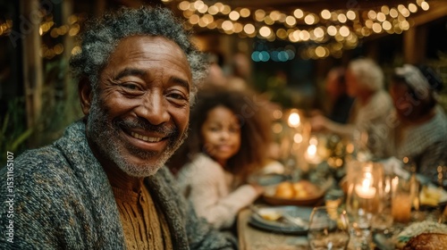Smiling Senior Man at a Warmly Lit Family Dinner