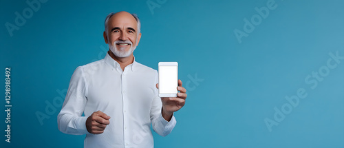 smiling senior man in elegant white shirt is showing empty screen of his mobile phone; photogenical old guy isolated over blue background with copy space; elderly people and tech interaction concept