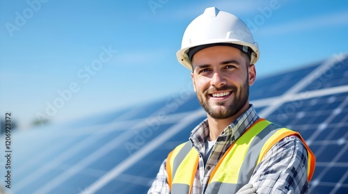 Smiling Solar Technician Working on Rooftop Solar Panels Under a Clear Sky (Industry)