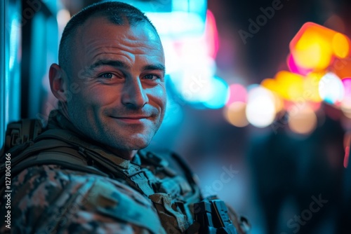 Smiling soldier enjoying a vibrant city night with colorful lights in the background