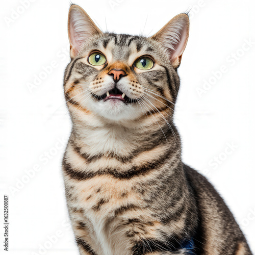Smiling Tabby Cat: Captivating portrait of a happy tabby cat, showcasing a charming smile with a delightful expression, with a playful and lighthearted atmosphere.