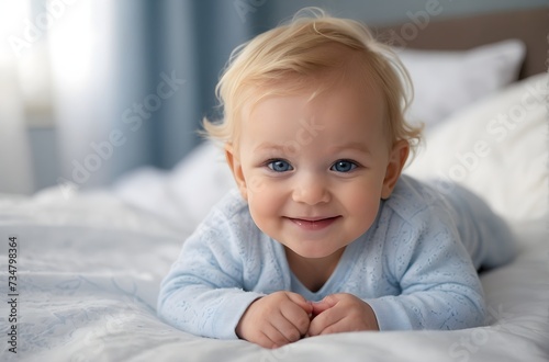 Smiling toddler enjoying a playful moment on the bed