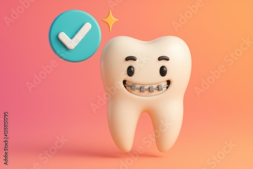 Smiling Tooth with Braces: A cheerful, cartoon-like tooth adorned with braces, radiating health and happiness, is accompanied by a checkmark, symbolizing dental wellness and perfect teeth.