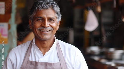 Smiling vendor in uniform, exuding warmth and professionalism in a simple portrait