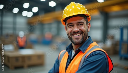 Smiling Warehouse Worker in Hard Hat and Safety Vest