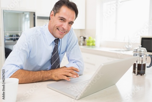 Smiling well dressed man using laptop in kitchen