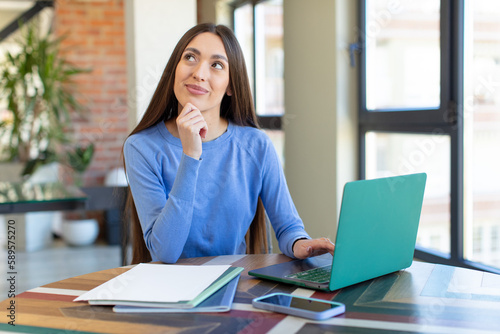 smiling with a happy, confident expression with hand on chin. laptop and desk concept