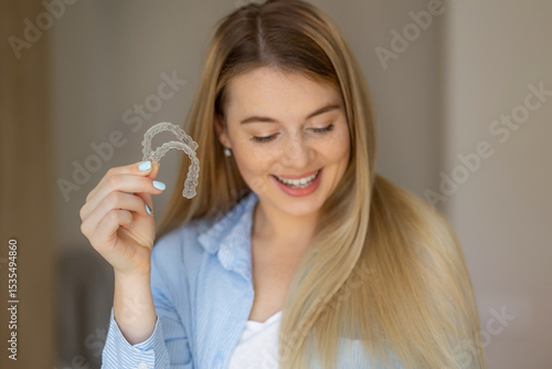 Smiling woman holding clear aligner showcasing orthodontic solution for teeth alignment