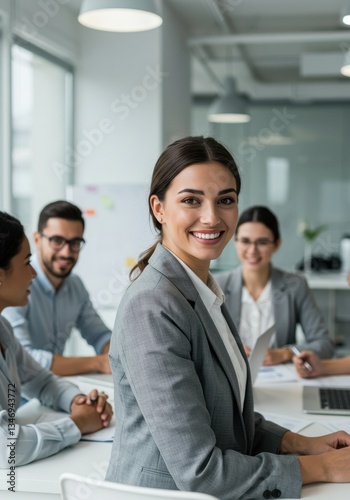 Smiling woman in gray blazer at conference table with colleagues in bright modern office space