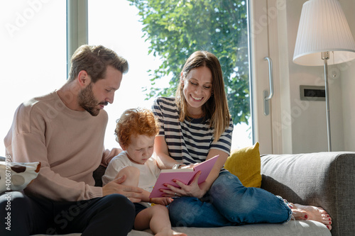 Smiling woman reading picture book while sitting by son and man on sofa in living room at home