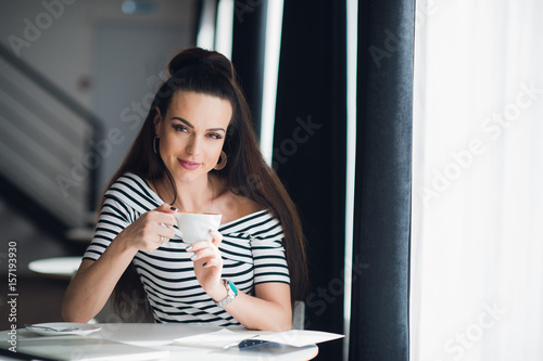 Smiling woman relaxing in a cafe with a cup of tea. Happy casual female drinking coffee and looking at the camera.