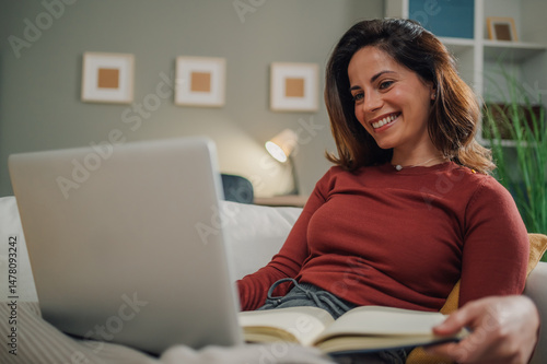 Smiling woman using laptop and reading book on sofa at home