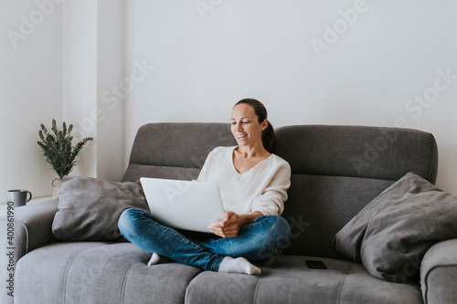 Smiling woman video calling from laptop while sitting on sofa at home