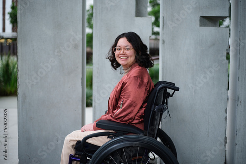 Smiling woman with a disability sitting in a wheelchair outside in urban setting