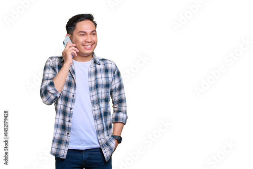 Smiling young Asian man in plaid shirt talking on mobile phone, looking aside at copy space isolated on transparent background