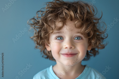 Smiling young boy with curly hair, blue eyes, close-up portrait against a blue background, joyful expression, capturing the innocence of childhood.