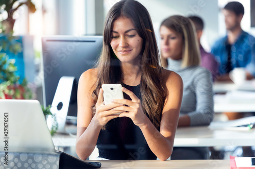 Smiling young businesswoman using her smartphone while working with computer in the modern startup office.