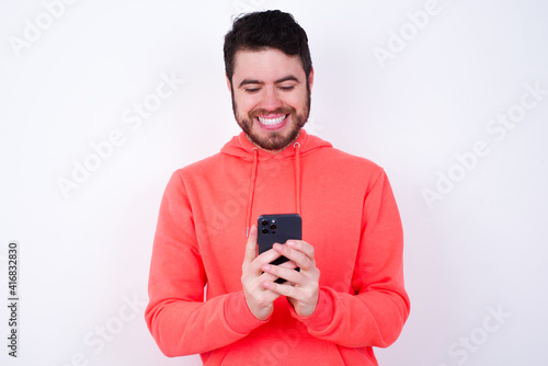 Smiling young Caucasian bearded man wearing pink hoodie against white using cell phone, messaging, being happy to text with friends, looking at smartphone. Modern technologies and communication.