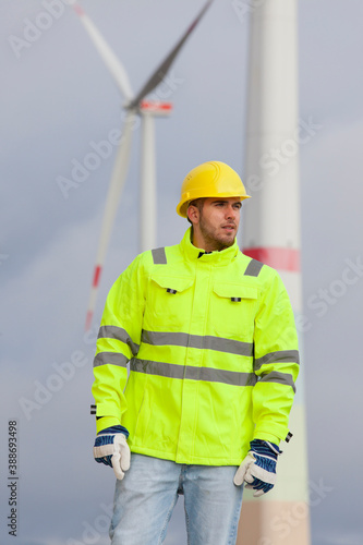 Smiling young engineer with hard hat and protective clothing in front of blurred wind turbines