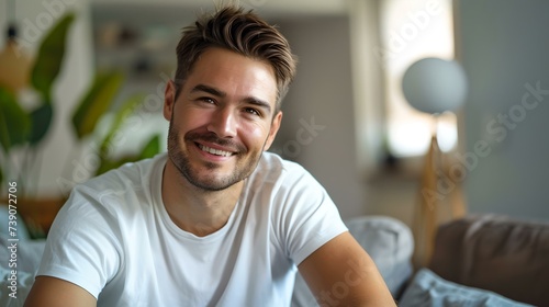 Smiling young man in a casual white t-shirt at home. relaxed, friendly male portrait with modern interior. lifestyle and leisure concept photo. AI