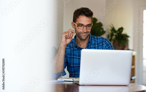 Smiling young man working online with a laptop from home