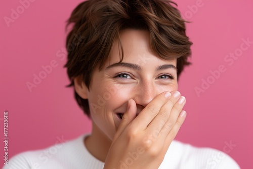 Smiling young person covering mouth playfully