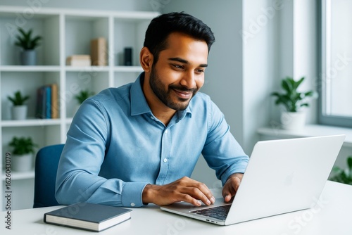 Smiling young person working on laptop in bright office with modern background and natural light, showing creative productivity and focus.