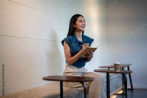 Smiling young woman engrossed in writing notes in a notebook in a café with a takeaway coffee cup on the table.
