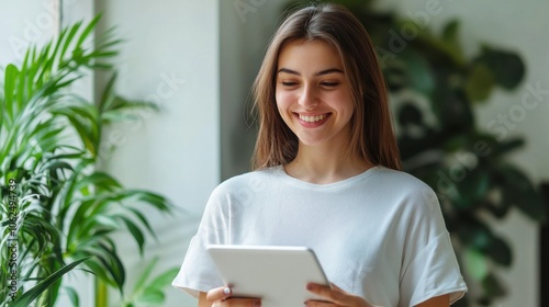 Smiling young woman holding and using a tablet, simple composition with minimal distractions.