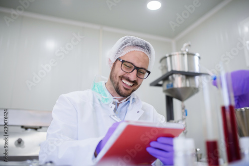 Smilling man writing test results while sitting in the lab.