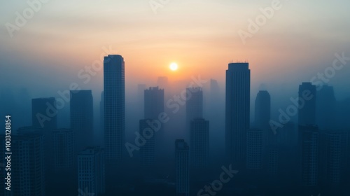 Smog-filled city skyline with hazy air and muted sunlight poor air quality warning
