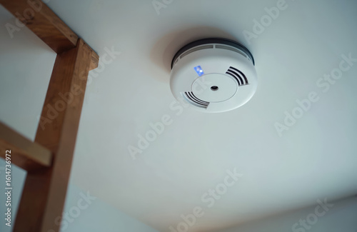 Smoke detector installed on white ceiling, featuring blue indicator light. Device represents home safety, fire prevention. Wooden beam visible in background, suggesting residential construction