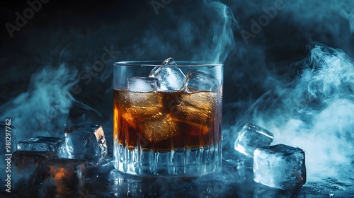 Smoked old fashioned rum cocktail with cubes of ice around on a dark background