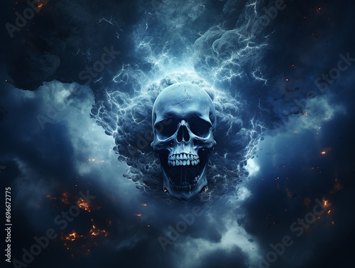 Smoked Skull Cloud Calamity Concept and Scary Abstract Digital Cloud Skull Image on a Blue Background