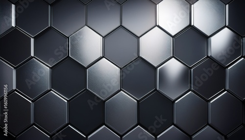 smoky charcoal gray gradient with abstract silver grid featuring glowing hexagonal panels