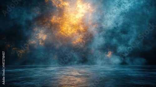 Smoky stage backdrop, dark studio, dramatic lighting, textured floor, event background