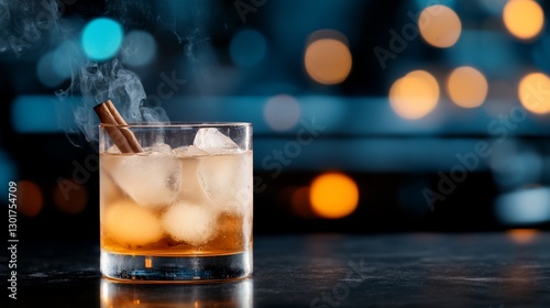 Smoky whiskey cocktail, bar, night, bokeh. Drinks menu